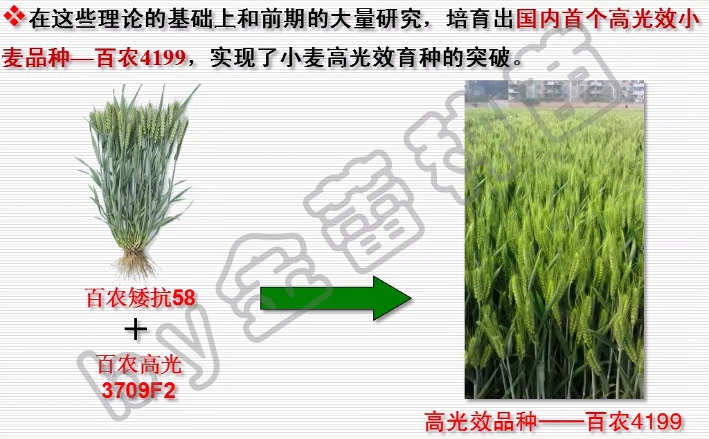 目標實施:茹振鋼教授科研團隊在全球采集小麥樣本,選擇了200個研究樣本進行對比。經(jīng)過3年研究,他發(fā)現(xiàn)靠近地球兩極的小麥耐弱光,葉片薄、葉片顏色黑;靠近赤道的小麥耐強光,葉片厚、葉片顏色淺。于是將兩者通過基因育種工程等科學技術手段相結(jié)合,培育出了葉片既厚且顏色深的國內(nèi)首個小麥高光效親本百農(nóng)高光3709F2 。 它可最大程度地利用陽光,增強了小麥的光合作用。