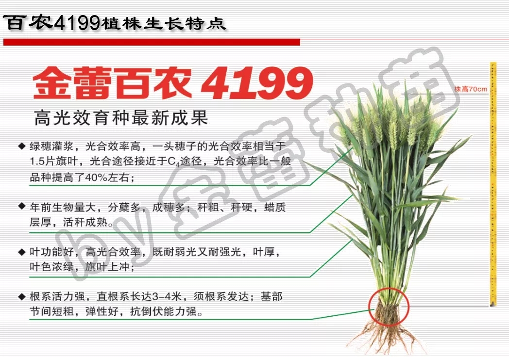 隨后,茹振鋼教授帶領團隊用高光效親本通過與百農(nóng)AK58雜交,先后研究解決麥穗、麥稈、根系等難題,克服了掉穗、營養(yǎng)供給不足等問題,成功培育出高光效小麥品種金蕾百農(nóng)4199。