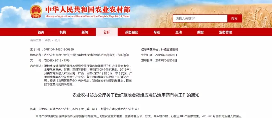 近日,農(nóng)業(yè)農(nóng)村部發(fā)布《農(nóng)業(yè)農(nóng)村部辦公廳關(guān)于做好草地貪夜蛾應(yīng)急防治用藥有關(guān)工作的通知》(下稱“《通知》”),發(fā)布草地貪夜蛾應(yīng)急防治用藥名單,暫定應(yīng)急用藥時(shí)間自2019年6月3日至2020年12月31日。