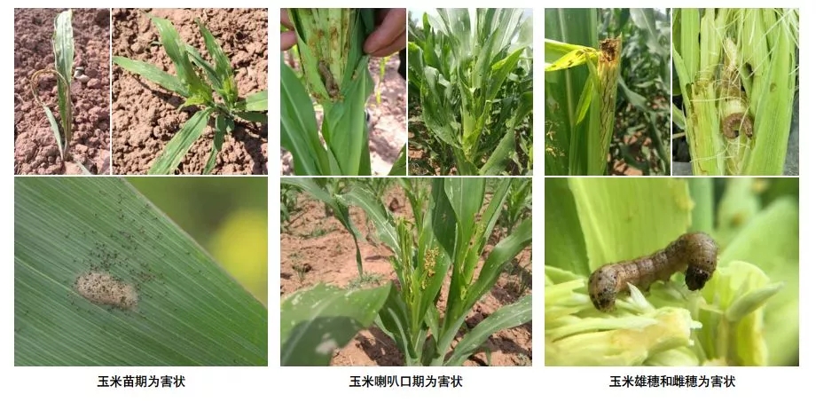 草地貪夜蛾無滯育現(xiàn)象,適宜發(fā) 育溫度廣,為 11 ~ 30℃,在 28℃條件 下,30d 左右即可完成 1 個(gè)世代。雌、 雄蟲均可多次交配,單頭雌蟲可產(chǎn)卵塊 10 塊以上,卵量約 1?500 粒。在玉米上,一至三齡幼蟲通常隱 藏在心葉、葉鞘等部位取食,形成半透 明薄膜“窗孔”;低齡幼蟲還會(huì)吐絲, 借助風(fēng)擴(kuò)散轉(zhuǎn)移到周邊的植株上繼續(xù)為 害;四至六齡幼蟲對(duì)玉米的為害更為嚴(yán) 重,取食葉片后形成不規(guī)則的長形孔 洞,可將整株玉米的葉片取食光,也會(huì) 鉆蛀心葉、未抽出的雄穗及幼嫩雌穗, 影響葉片和果穗的正常發(fā)育。苗期嚴(yán)重 被害時(shí)生長點(diǎn)被破壞,形成枯心苗。