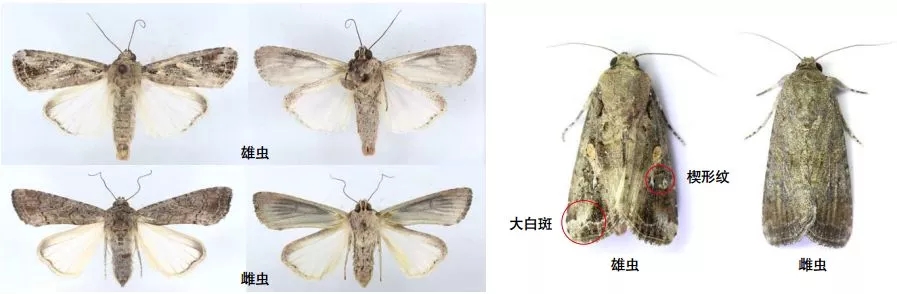 成蟲:翅展 32 ~ 40m m , 前翅深棕色,后翅白色,邊緣有窄褐色帶。雌蛾前翅呈灰褐色或灰色棕色雜色,具環(huán)形紋和腎 形紋,輪廓線黃褐色;雄蛾前翅灰棕色,翅頂角向內(nèi)各具一大白斑,環(huán)狀紋后側(cè)各具一淺色帶自翅外緣至中室,腎形紋內(nèi)側(cè)各具一白色楔形紋。
