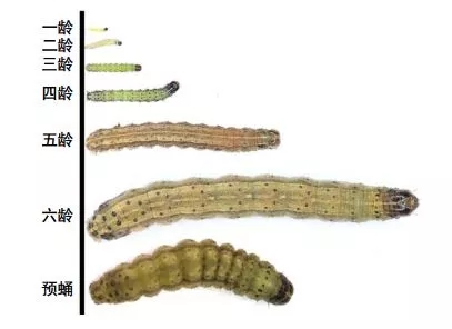 幼蟲:一般有 6 個(gè)齡期,體長 1 ~ 45m m , 體色有淺黃、淺綠、褐 色等多種 , 最為典型的識(shí)別特征是末端腹節(jié)背面有 4 個(gè)呈正方形排 列的黑點(diǎn),三齡后頭部可見的倒 Y 形紋。