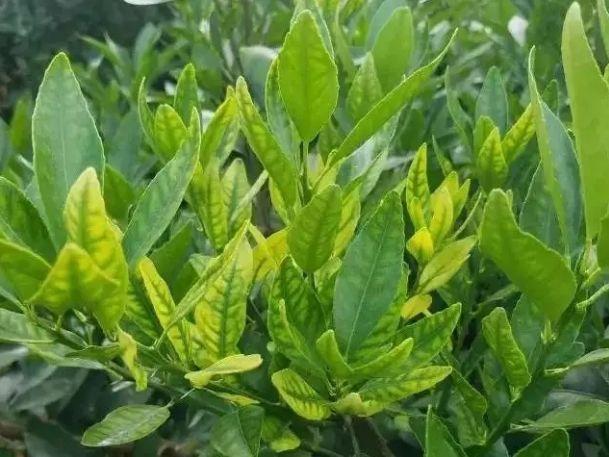 比如,柑橘缺硫時,葉脈先變黃,但葉肉還是綠色的: