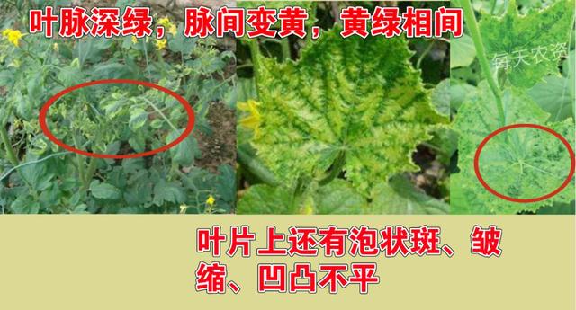 圖片上的病株,猛的一看,葉脈深綠,葉脈間褪綠變黃,可能會覺得是缺元素,但是跟缺素癥狀不同的是,病毒病的病葉上不僅會出現(xiàn)濃綠和淡綠相間的斑駁,葉片上還會有泡狀斑、皺縮,葉面常常會凹凸不平等癥狀;而缺素時,葉片上一般不會出現(xiàn)泡狀斑或者凹凸不平的癥狀(除了缺硼)。