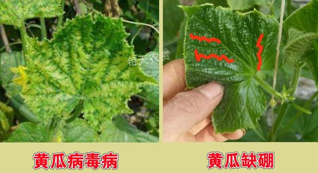 黃瓜病毒病跟黃瓜缺硼同樣都是葉片皺縮、畸形。但是,缺硼的時候,葉脈會明顯的變形,而發(fā)生病毒病時,葉脈幾乎不變形,通過這點(diǎn)也可以進(jìn)行區(qū)分。